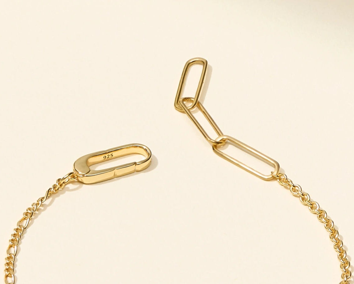 Two classic chains, one timeless piece – the Mixed Media Bracelet pairs a rounded figaro with a dainty cable chain for effortless versatility.